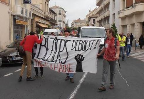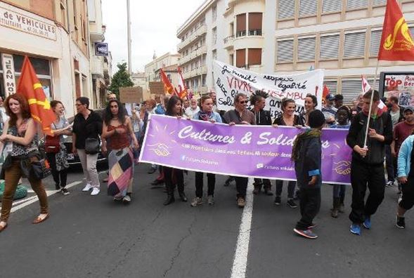 Il doit être plus de 14h00 quand on commence à défiler. En tête un calicot de « Cultures solidaires » résume l’opposition au racisme et à la xénophobie dont on doit traiter dans les salles où confèrent les penseurs les plus anachroniques. Il est précédé, à l’avant de la camionnette qui porte la sono, de celui de « Béziers Debout ».