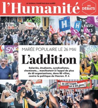Jean-Luc Mélenchon reprend sous le titre "Marées populaires : de belles initiatives citoyennes !", le communiqué de Copernic/Attac "Ce sont près de 80 organisations qui, en unissant leurs forces, ont rassemblé des centaines de milliers de manifestantes et manifestants"... Il affirme que "Le bilan de la marée populaire du 26 mai est fécond", évoquant des cortèges "dans près de 200 villes" qui ont "dans de nombreux cas surpris par leur nombre". Il considère que "le goût de ce type de rassemblement politico-social s’est découvert, il ne se perdra pas de sitôt". Il conclut en prédisant "la marée fera des petits"... Le PRCF est plus précis et évoque "plus de 80.000 manifestants à Paris, 65.000 à Marseille et des centaines de milliers dans les plus de 200 manifestations en France", concluant "c’est bien une première marée populaire qui s’est levée en France ce 26 mai. La rengaine des chiens de garde des médias ne doit leurrer personne. S’ils mordent c’est parce qu’ils ont peur de la colère populaire"...