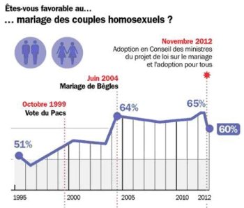 Selon l’Enquête INSERM-INED sur la « Sexualité en France » (2006) [2], « 4,0% des femmes et 4,1% des hommes de 18 à 69 ans déclarent avoir déjà eu des pratiques sexuelles avec un partenaire du même sexe » et « seuls 0,3% des femmes et des hommes n’ont eu au cours de leur vie que des pratiques sexuelles avec des personnes du même sexe » [3]. C’est au sein de ces 0,3%, environ 160.000 personnes [4], que se pose donc la question du mariage. Ce pourcentage ne devrait pas générer une telle effervescence. Sauf si un autre constat de l’enquête est pris en considération : la préférence homosexuelle n’est pas répartie de façon homogène sur le territoire français, mais concerne davantage des personnes habitant l’agglomération parisienne et ayant un niveau d’étude supérieur à Bac+2. Ce constat invite à le corréler à d’autres disparités du territoire français. En effet ce n’est qu’en croisant la variable « vie sexuelle » avec celles du niveau de formation, du rapport au religieux, de la situation socio-économique, du lieu d’habitat, de la ségrégation culturelle inter- et intra-urbaine [5], de l’histoire locale, de la préférence politique, qu’il devient possible de comprendre la construction des regards sur la famille homosexuelle, donc les fractures sociales et géographiques qui en découlent ainsi que les réactions contradictoires.