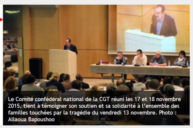 « Le Comité confédéral national de la CGT réuni les 17 et 18 novembre 2015, tient à témoigner son soutien et sa solidarité à l’ensemble des familles touchées par la tragédie du vendredi 13 novembre. Elle salue à nouveau la mobilisation extraordinaire de l’ensemble des agents des services et entreprises publiques.