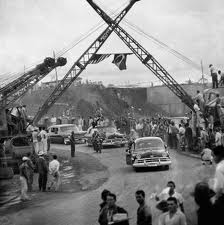 Commentaires d’un reportage d’époque : Les capitaines de la plus pacifique et de la plus dure bataille brésilienne tracent les plans des chemins de vie, tandis que les lourds engins de cette guerre ouvrent, conquièrent et soumettent l’immense espace. 25.000 chevaux seront produits par une usine située à 13 km de la cité. A Brasilia se formera un lac plus grand que la baie de Guanabara.