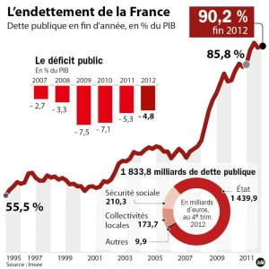 Ainsi, Benoist Apparu (ancien secrétaire d’Etat, ancien Député, ancien Ministre et actuellement Maire de Châlons-en-Champagne) a pu déclarer : « Demain matin nous sortons de l’euro. [...] Ça fait du jour au lendemain 400 milliards d’euros de dette ! ». Du jour au lendemain ? Vraiment ? Eh bien non, ce constat est tout simplement faux. Il est fondé sur un argument économique bancal : la dette publique française est détenue en majorité par des étrangers et la dévaluation de la nouvelle monnaie ferait automatiquement augmenter la dette. Afin de simplifier les choses, je ne vais m’intéresser qu’à la dette de l’Etat, qui représente 80 % de la dette publique totale (2 000 milliards d’euros), et étudier l’impact d’une dévaluation sur cette dernière ceteris paribus [1].