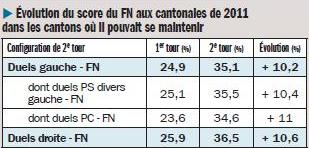 En dépit des commentaires sur « l’échec du FN », analyse fondée sur le très faible nombre de cantons gagnés, on constate une progression importante de plus de 10 points, quelle que soit la configuration de second tour (voir tableau ci-dessous).