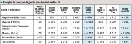 Le FN progresse autant face au PC que face au PS ou à l’UMP. Cela démontre qu’il dispose de réserves importantes et diversifiées. Dans les cantons où se déroulait un duel droite-FN, la progression de près de 11 points du score du FN ne peut s’expliquer sans reports significatifs d’une partie de l’électorat de gauche. On peut, certes, objecter que les renforts en voix dont a bénéficié le FN dans ces cantons pourraient provenir d’abstentionnistes du premier tour ou d’électeurs de candidats de droite éliminés, mais cela ne saurait suffire à produire une poussée de 11 points pour le FN au second tour. De notre point de vue, des reports conséquents en provenance de la gauche ont bien eu lieu. Pour s’en convaincre, on peut s’intéresser au cas de cantons où le nombre de suffrages exprimés a très peu varié entre les deux tours et où il n’y avait, au premier tour, que des candidats de gauche et un candidat du FN et un candidat de droite. Dans ces cantons où la gauche a été éliminée laissant la place à un duel droite-FN, l’observation des transferts est donc plus aisée et plus nette. Or, comme on peut le voir dans le tableau suivant, il apparaît de manière assez manifeste qu’une fraction de l’électorat de gauche a voté FN au second tour (voir tableau ci-dessous).
