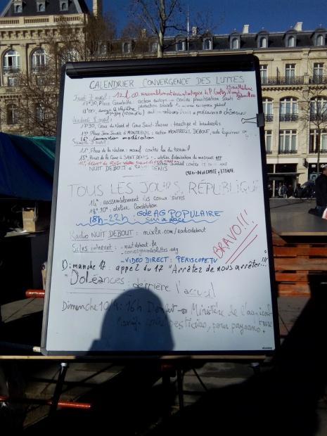 Les auteurs de l’acte ont voulu le signifier comme tel, utilisant un nouveau calendrier pour se repérer dans le temps, à partir de cette date du 31 mars 2016. Cela n’est pas sans rappeler le nouveau calendrier mis en place après la Révolution française. Mais ici il ne s’agit pas de remplacer un calendrier en reprenant les mêmes espaces du temps et en les nommant autrement. L’espace-temps qui fait repère, le mois, a été brisé et le 31 mars tente de prendre une autre place en rapport au temps et cela a valeur de signe lorsque l’on sait que le temps dans notre système de vie économique est converti en valeur argent depuis maintenant trop longtemps.