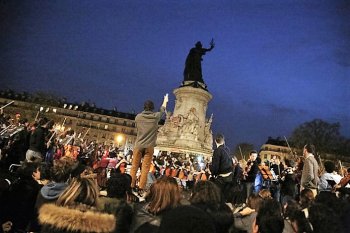 Sur la place de la République, la nuit est tombée depuis longtemps, la foule est nombreuse. Un orchestre symphonique achève dans l’enthousiasme de jouer la Symphonie du Nouveau Monde.