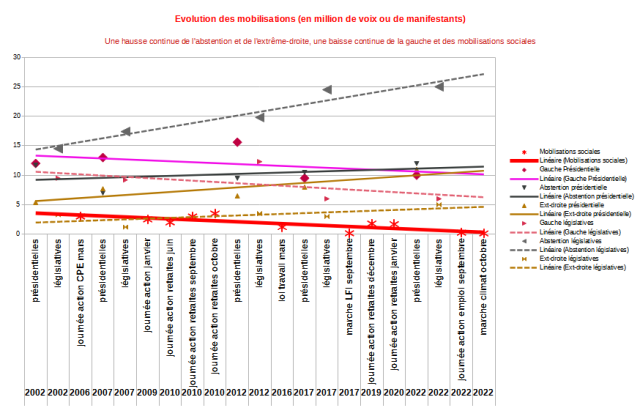 Voici un graphe des grands évènements électoraux ou sociaux en millions de voix ou de manifestants estimés par les organisateurs (tableau de données en notes). Il montre bien les tendances depuis 20 ans, les progrès de l’abstention et et de l’extrême-droite, et l’affaiblissement social et politique de la gauche et du monde du travail.