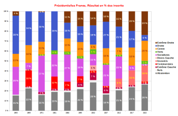 Si on regarde sur le long terme pour comprendre la crise de la gauche, on voit que depuis 2002, le PC se maintient en pourcentage des inscrits autour de 2% (2,3 en 2002, 1,6 en 2007, 1,7 en 2022...), que les verts se maintiennent autour de 3% (5% en 2002, 1% en 2007, 3% en 2022), que l’extrême-gauche reste à 1% des inscrits, après sa pointe à 7% en 2002 et 6% en 2007, son électorat ayant massivement rejoint Mélenchon depuis.