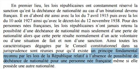 En premier lieu, les lois républicaines ont constamment réservé la sanction qu’est la déchéance de nationalité au cas d’un binational devenu français. Il en d’abord été ainsi avec la loi du 7 avril 1915 puis avec la loi du 10 août 1927 ainsi qu’avec le décret-loi du 12 novembre 1938. Pour des personnes nées françaises, les lois républicaines n’ont jamais retenu la possibilité d’une déchéance de nationalité mais seulement d’une perte de nationalité alors que cette perte résulte normalement d’un acte volontaire ou d’une situation de fait et non d’une sanction. Ainsi toutes les caractéristiques dégagées par le Conseil constitutionnel dans sa jurisprudence sont réunies pour qu’il existe un principe fondamental reconnu par les lois de la République relatif à l’absence de possibilité de déchéance de nationalité pour une personne née française même si elle possède une autre nationalité.
