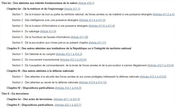 Il faut d’ailleurs souligner que figurent d’ailleurs dans le code pénal aux articles visés par le Conseil d’État “Des atteintes aux intérêts fondamentaux de la nation” des crimes et délits tels que :