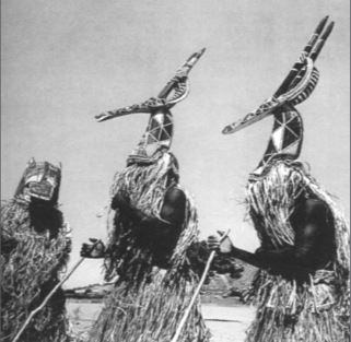 Sortie de masques figurant l’antilope lors d’une cérémonie de levée de deuil des chefs de terre. Burkina Faso