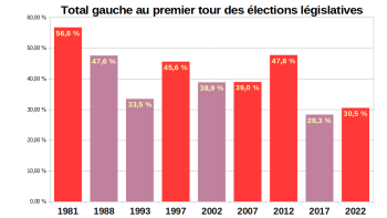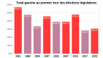 Total gauche aux législatives colorés selon la situation politique. En rouge, après un gouvernement de droite, en violet, après un gouvernement de gauche. En théorie, après un gouvernement de droite, la gauche est plus forte. De ce point de vue, 2022 est un plus bas, même s’il y a une très légère progression sur 2017 !