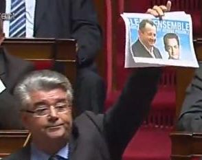(André Gerin brandit une photo qui représente Nicolas Sarkozy et son frère, Guillaume Sarkozy, sous le mot d’ordre de la campagne UMP à l’élection présidentielle : « Ensemble, tout est possible »)