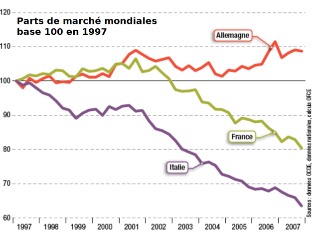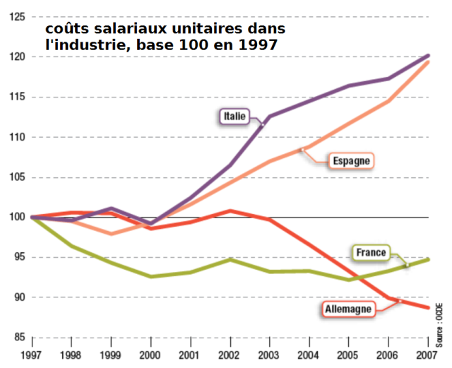 Mais la France perd du terrain même quand son coût salaral baisse ! Soyons clair, c’est la patronat Français qui est moins efficace, avec une stratégie concentrée sur quelques secteurs, fortement dépendante des aides de l’état, et de la domination sur des pays du Sud. Le deal européen avec l’Allemagne nous coûte de + en + cher.