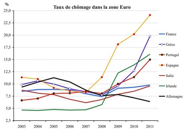 L’Italie est, elle aussi, en train d’entrer en récession sous l’impact des mesures d’austérité décrétée par Mario Monti. Elle aussi s’apprête à connaître un recul du PIB. La France enfin, qui tablait sur une croissance de 1,5% pour 2012, ne connaîtra que 0,4% de croissance au mieux en 2011. En réalité, l’économie française est déjà en stagnation, le pouvoir d’achat recule, et les perspectives pour 2013 sont constamment révisées à la baisse.