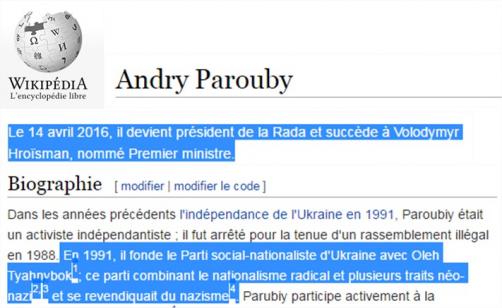 En 2016, la majorité des députés ukrainiens a trouvé que ce Parouby présentait un excellent profil, et l’a élu Président du Parlement (ce qui en dit long sur la classe politique actuelle de ce pays) (wikipédia) :