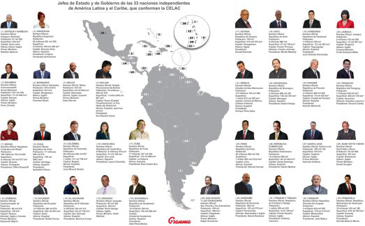 La CELAC, qui rassemble 600 millions d’habitants, a commencé ses travaux en 2011. Même si, historiquement, cette union aurait pu être attribué à Fidel Castro qui a toujours cherché à rassembler face à l’impérialisme US, elle a été l’aboutissement des efforts récents du président Chavez pour accélérer l’unité politique et sociale des latino-américains, jusque là freinée par une OEA basée à Washington et instrumentalisée par les États-Unis.