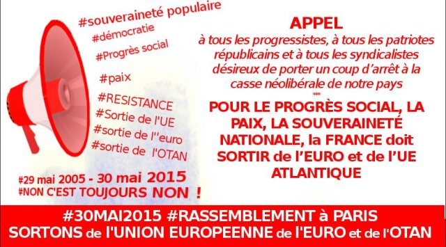 En nous appuyant sur les luttes en cours et celles en devenir, nous proposons aux militants et aux organisations communistes, aux syndicats, aux progressistes et patriotes antiracistes et antifascistes, à tous ceux qui s’opposent à cette guerre de classe européenne, qui ont milité pour la victoire du NON au TCE, de faire de ce mois de mai un moment de mobilisation pour la sortie du carcan de l’UE, de l’euro et de l’OTAN jusqu’à un rassemblement national le 30 mai 2015 à Paris.