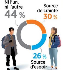 L’avenir de l’Europe vu par les jeunes Français est plutôt sombre. Les 18-34 sont 65 % – davantage que l’ensemble des Français – à prédire que, dans les dix prochaines années, d’autres grands pays historiques de la construction européenne sortiront de l’Union, comme vient de le faire le Royaume-Uni. Et, comme leurs aînés, ils voient proliférer sur le Vieux continent les contestations populaires de type Gilets jaunes ou Indignados en Espagne, et se multiplier les gouvernements populistes et autoritaires comme en Hongrie ou en Pologne. « Il y a vingt ans la jeunesse française rêvait de vivre l’Auberge espagnole de Romain Duris, aujourd’hui elle semble craindre que l’UE ne lui rejoue le Grand dictateur de Charlie Chaplin », conclut le politologue.