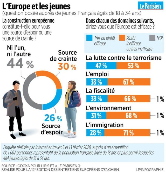 Pourquoi ce désamour ? « Parce que nos concitoyens pensent que l’action de l’Europe n’est pas efficace dans les domaines les plus importants à leurs yeux, notamment sur l’emploi et l’environnement », répond Gaël Sliman, président de l’institut Odoxa. Ainsi, alors que l’emploi est la priorité numéro 1 pour 72 % des jeunes, ils sont 67 % à juger l’UE « inefficace » sur ce sujet. De même, la grande majorité des 18-34 ans (68 %) n’attend rien d’elle sur l’environnement, deuxième priorité. Un comble, quand on se souvient que la nouvelle Commission présidée par Ursula von der Leyen a fait de son « Green new deal » – Pacte vert – son point fort. À l’évidence, les actes forts avec des résultats visibles vont devoir supplanter d’urgence les belles paroles.