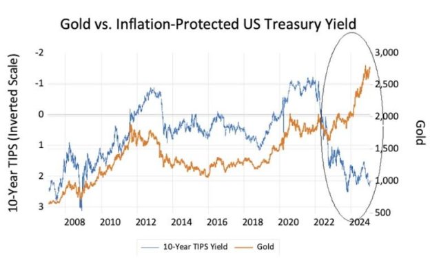 Deuxièmement, comme nous l’avons souvent noté, l’or s’est négocié en tandem avec le rendement des bons du Trésor américain protégés contre l’inflation, ou TIPS. Les deux sont des formes d’assurance contre l’inflation inattendue et la forte dépréciation du dollar. Mais l’or s’est découplé des rendements des TIPS en mars 2022 après que les États-Unis et leurs alliés ont saisi 300 milliards de dollars de réserves de change russes. Une police d’assurance que l’assureur peut saisir à volonté est moins attrayante que de l’or dans les coffres d’une banque centrale.