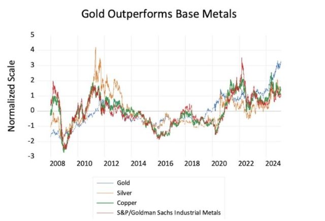 Tout d’abord, l’or a cessé de s’échanger avec d’autres métaux, notamment l’argent, le cuivre et d’autres métaux industriels. Cette relation a prévalu de 2007 à la fin de 2023. Au cours de la dernière année, l’or a grimpé en flèche alors que les autres métaux ont peu changé.