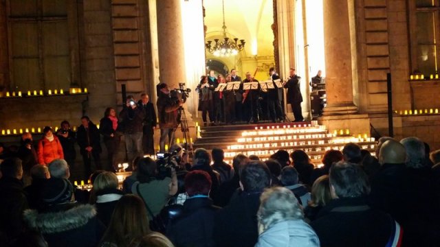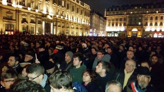 Les milliers de personnes rassemblées en quelques heures sur la place des Terreaux hier soir, (15.000 dit le Progrès ; mais qui a compté tous ceux qui cherchait à rejoindre la place dans tout le centre ville ?), sont la première réponse, entre recueillement, cris pour Charlie et Marseillaise.