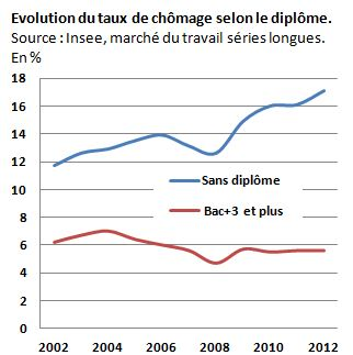 La France qui trinque est d’abord celle qui n’a pas eu la chance d’être estampillée bonne élève par le système éducatif (voir encadré sur le décrochage). Même si quelques diplômés ont du mal à s’insérer rapidement, les jeunes en difficulté sont massivement ceux qui n’ont pas eu la chance de faire des études. Le taux de chômage des sans diplôme est passé de 12,6 à 17,1 % entre 2008 et 2012, celui de ceux qui disposent d’un diplôme supérieur à bac + 2 de 4,7 à 5,6 %. Et encore, ces données ne prennent pas en compte les décrocheurs de l’emploi, notamment des femmes peu qualifiées, qui, devant la dégradation des conditions d’emploi (précarité et bas salaires), ne postulent même plus. Dans un pays où la croyance dans les titres scolaires est démesurée, le clivage social le plus profond porte sur le diplôme. Même périmé après des années de travail, il marque ensuite le parcours des salariés tout au long de leur vie professionnelle.