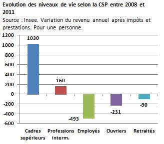 Les trois dixièmes de la population situés entre les 40 % les plus pauvres et les 30 % les plus riches ont vu leur situation stagner. Les classes moyennes ne sont pas « étranglées », selon l’adage médiatique, leur situation n’est pas la plus difficile, mais cette stagnation constitue une rupture pour des catégories au cœur d’une société où l’on consomme toujours plus. Pour cela, il faut gagner davantage et ce n’est plus le cas. Enfin, parmi les 40 % du bas de la hiérarchie sociale, les revenus diminuent de 300 à 400 euros (données annuelles). Cette France qui décroche a un visage : c’est celle des employés et des ouvriers, qui ont perdu respectivement 500 et 230 euros sur l’année entre 2008 et 2011, quand les cadres ont gagné 1.000 euros, soit un mois de travail d’un Smicard.