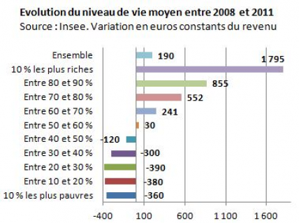 + 1 800 euros annuels pour les 10 % les plus riches, - 400 euros pour les 10 % les plus pauvres. Le bilan de l’évolution des revenus sur la période 2008-2011 [1] est sombre pour les milieux populaires. La « baisse généralisée du pouvoir d’achat » [2], tant médiatisée, est une imposture : le pouvoir d’achat augmente pour les plus riches et diminue pour les plus pauvres.