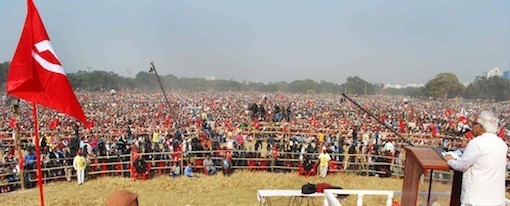 Autour d’un million de communistes et de sympathisants se sont rassemblés au centre de Calcutta lors d’un rassemblement de masse le 27 décembre 2015. Le rassemblement s’est déroulé dans un lieu [vaste espace vert au centre de Calcutta] appelé tantôt « le Maïdan » ou « Brigade Ground », terrain de parade [sorte de Champ de Mars]. Des drapeaux rouges étaient déployés d’un bout à l’autre du Maïdan. Deux événements distincts, mais liés, ont motivé cette démonstration de force. Le premier, d’importance : les élections à l’Assemblée du Bengale Occidental auront lieu en 2016. Le second est la tenue d’un plenum organisationnel par le Parti communiste d’Inde (Marxiste) [CPI-M], la première rencontre de ce type depuis 37 ans. Le plenum va durer quatre jours. Il va non seulement préparer le CPI-M aux défis électoraux à court terme mais aussi réfléchir à questions politiques à plus long terme. Le CPI-M demeure le plus important parti de gauche en Inde. Il travaille en partenariat étroit avec d’autres partis de gauche dans des alliances électorales et politiques.