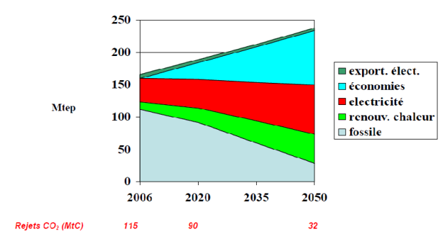 Ce scénario intègre un très fort développement des énergies renouvelables pour la production d’électricité (de 0,8 à 4,1 Mtep), dans un contexte de maintien de la part du nucléaire autour de 75% de la production électrique, ce qui suppose le remplacement progressif des centrales actuelles par des EPR ( 2ou 3 projets après celui de Flamanville à lancer d’ici 2020).