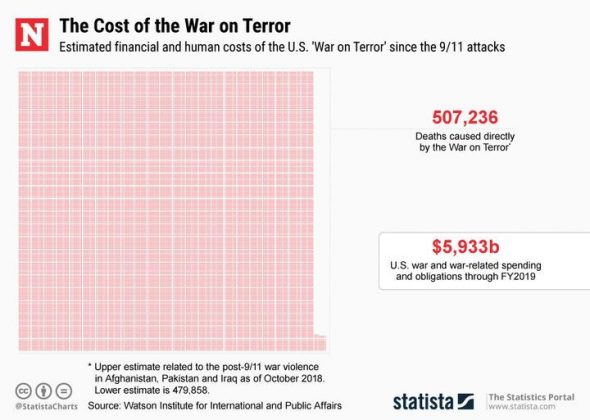 Le décompte final a révélé que « les États-Unis ont affecté des crédits et sont tenus de dépenser environ 5,9 milliards de dollars (en dollars courants) pour l’exercice 2019, dans le cadre de la guerre contre le terrorisme, incluant la guerre directe, et les dépenses et engagements futurs en lien avec la guerre et destinés aux vétérans de guerre post-11 septembre ».