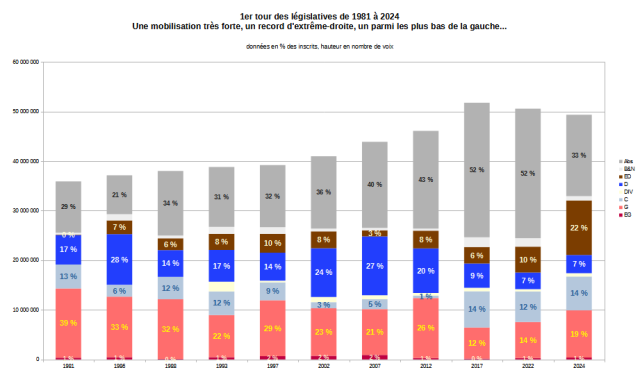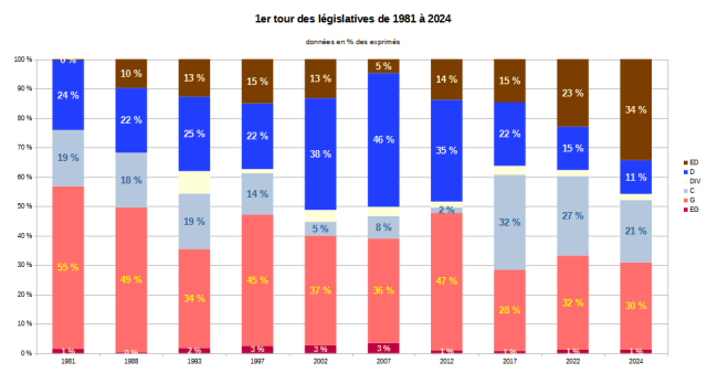 Le deuxième graphique montre les résultats depuis 1981 avec un histogramme reposant sur le nombre de voix exprimées (donc sans les abstentions), qui fait donc encore mieux apparaitre la mobilisation exceptionnelle, mais qui affiche le résultat en % des exprimés, illustrant bien la défaite de la gauche, à un niveau historiquement bas de 30% (avec les divers gauche hors nouveau Front Populaire).