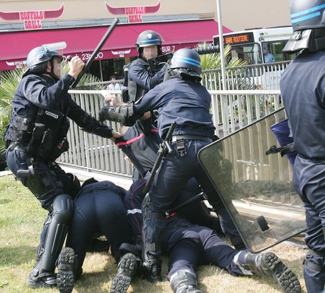 Suite a la manifestation « pacifiste » des pompiers des Alpes maritimes revendiquant la reconnaissance de métier a risque et la pénibilité du métier pour la réforme des retraites ,les C R S ont chargé les pompiers violemment .Le pompier a terre sur la photo a pris un coup de matraque dans la tête sans raison , transporté inconscient a l’hopital de nice il se réveillera dans l’apres midi.5 pompiers ont été mis en garde a vue.