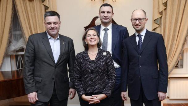 Au début de la crise, Nuland a rencontré plusieurs personnalités de l’opposition, dont Oleh Tyhanybok. Aucun détail sur cette discussion n’a été rendu public, mais l’ambassadeur Pyatt a publié sur Twitter une photo d’une Nuland souriante posant à côté du dirigeant pro-nazi et de ses collègues.